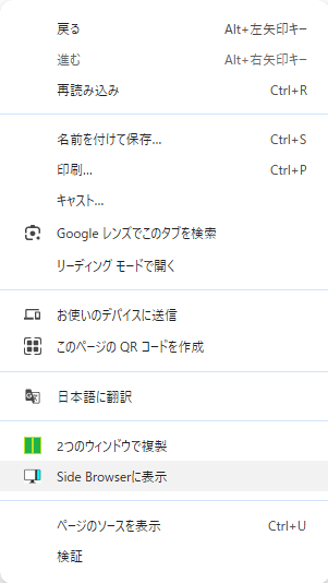 メイン画面で気になるリンクを見つけたら、右クリックメニューから「Side Browserに表示」を選択するだけ。メインの作業を中断することなく、対象のページをサイドパネル側で素早く開くことができます。